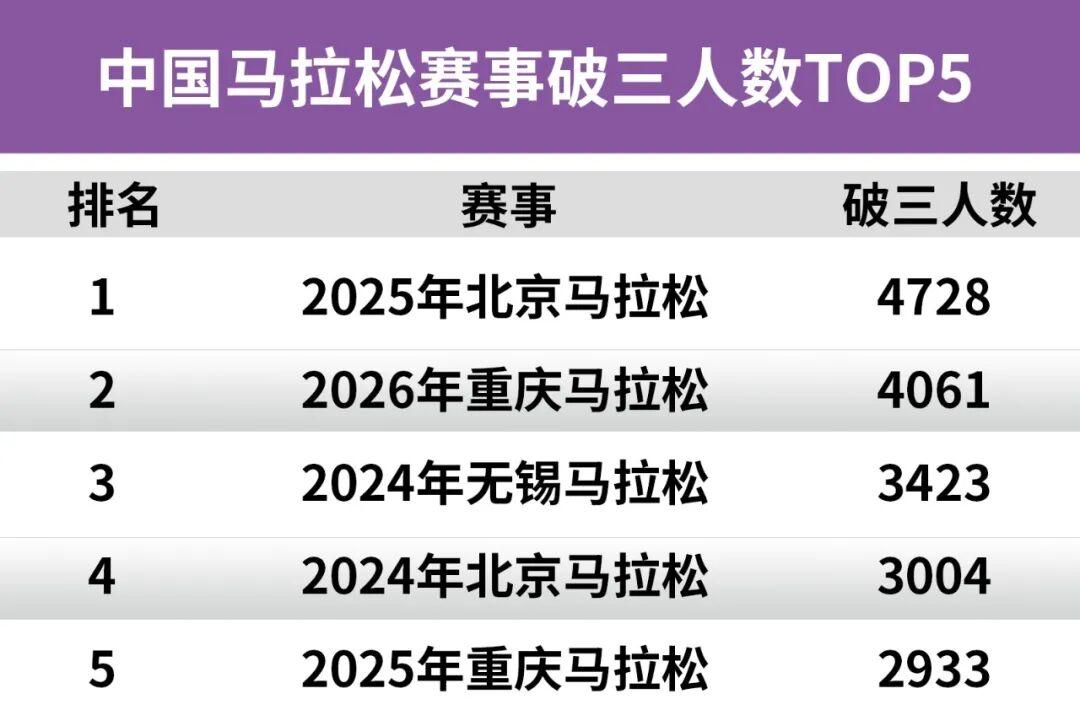 竞技之外,数据更为直观。本届重马“破三”人数达4061人,远超去年的2933人,位列国内第二,仅次于2025北京马拉松的4728人,全球排名第5,印证了中国大众马拉松整体提速的强劲趋势。