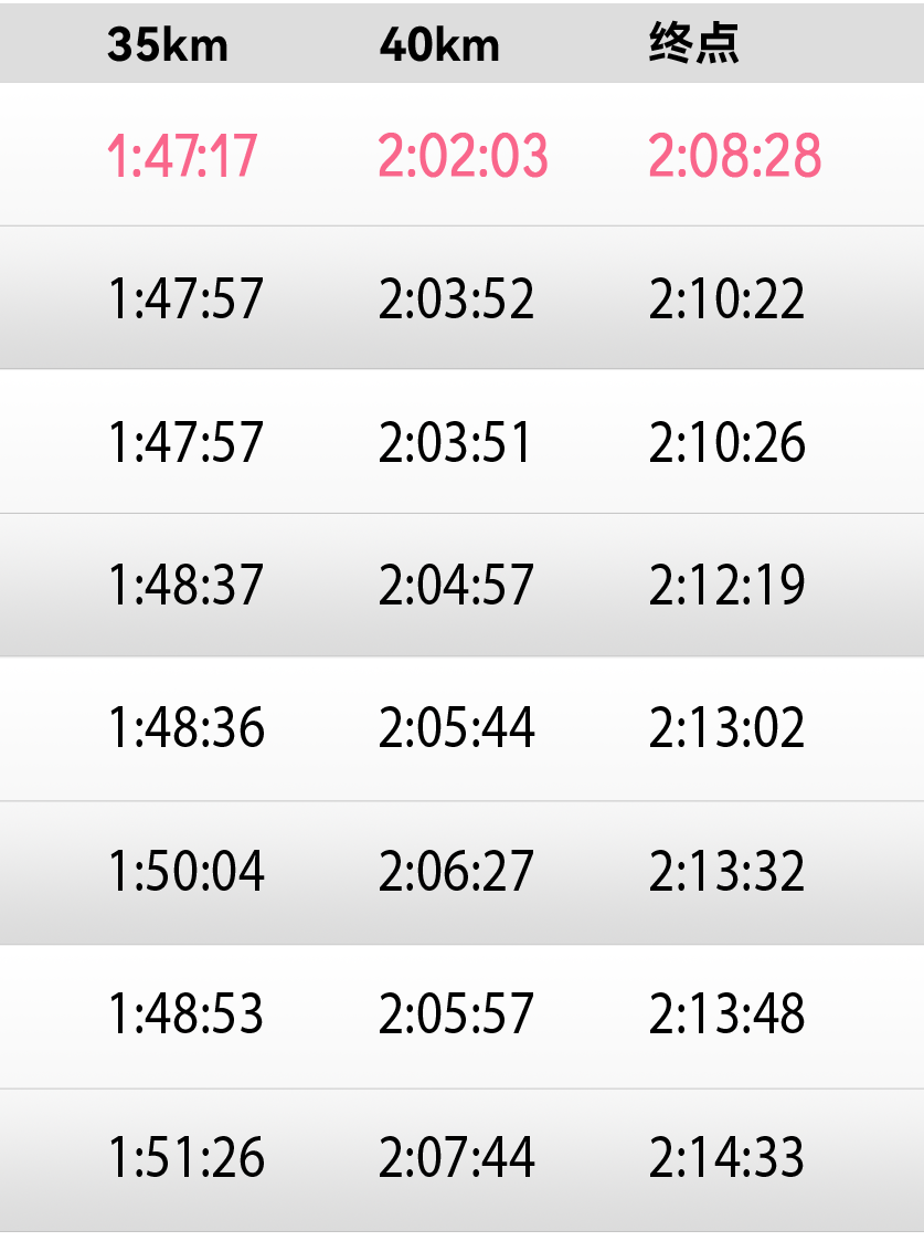 武明瑶在30公里后确立优势,最终以2:12:18获得国内亚军。董国建虽然被拉爆,但依然维持住了节奏,在冲线前激动甩掉帽子,以2:13:02获得国内第三。